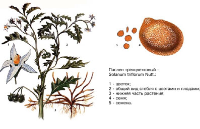 Паслен трехцветковый - это однолетнее травянистое растение. Стебли прямые или распростертые, голые или слабоопушенные, сильноветвистые, длина 20-80 см. Листья очередные, перисто-рассеченные или глубоко раздельные, удлиненные или овальные, рассеянно-опушенные простыми волосками, длина 2,5-7,5 см. Цветки (по 3) в пазухах листьев, венчик белый или бледно-желтый, у основания спаянный, пятилепестной, диаметром 0,6-0,9 см. Плод – ягода зеленого, желтого или черно-бурого цвета диаметром 1,2 см. Семена яйцевидно-округлые, плоские; на вершине округлые, у основания суженные и несколько вытянутые с небольшим носиком. Поверхность семян тонко-сетчатая, мелкоячеистая, окраска – от светло-желтого до светло-коричневого.